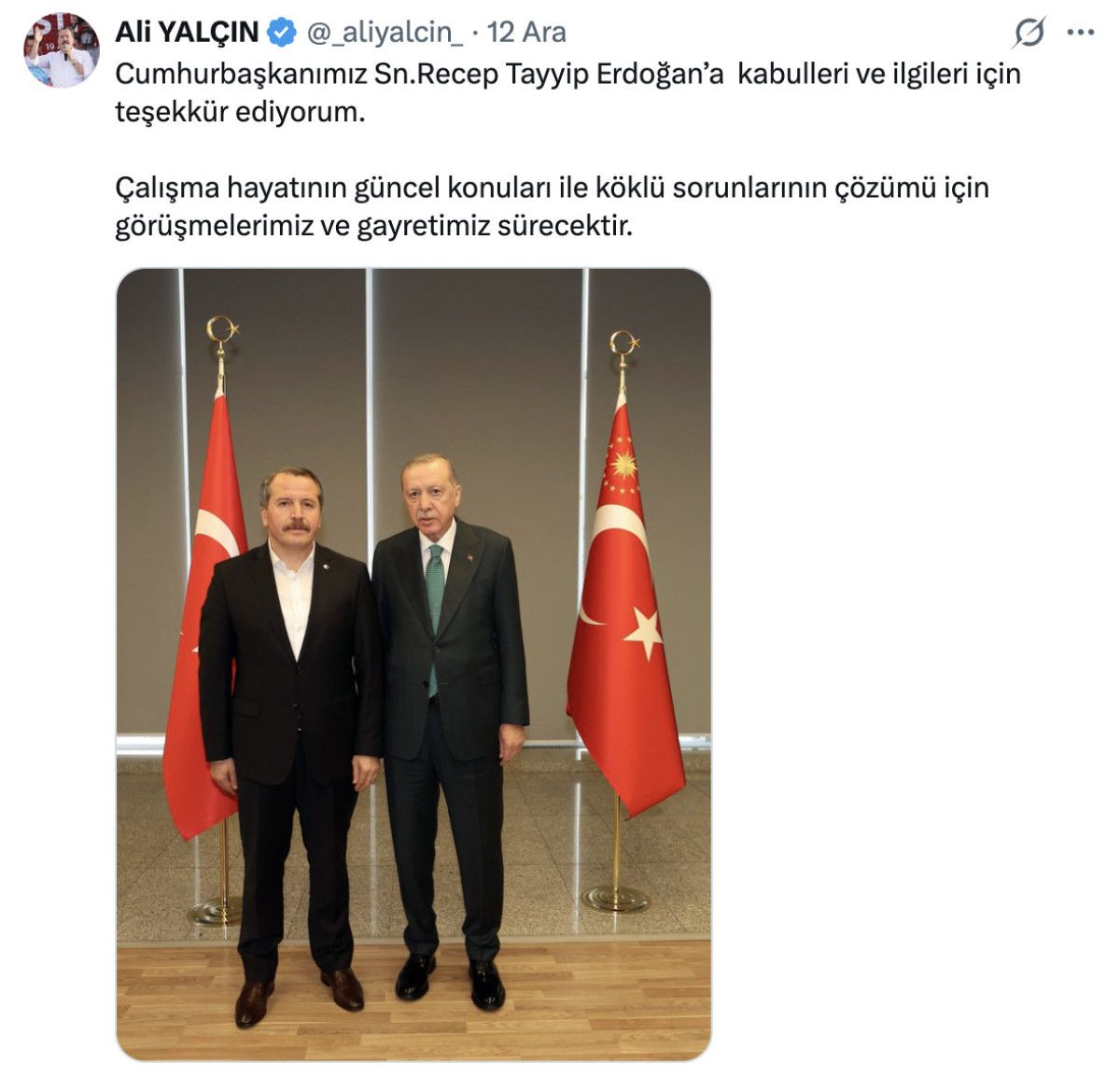 Görüşmenin ardından Yalçın, çalışma hayatına ilişkin temasların süreceğini belirterek,  “Cumhurbaşkanımız Sn. Recep Tayyip Erdoğan’a kabulleri ve ilgileri için teşekkür ediyorum. Çalışma hayatının güncel konuları ile köklü sorunlarının çözümü için görüşmelerimiz ve gayretimiz sürecektir.” ifadelerini kullandı.