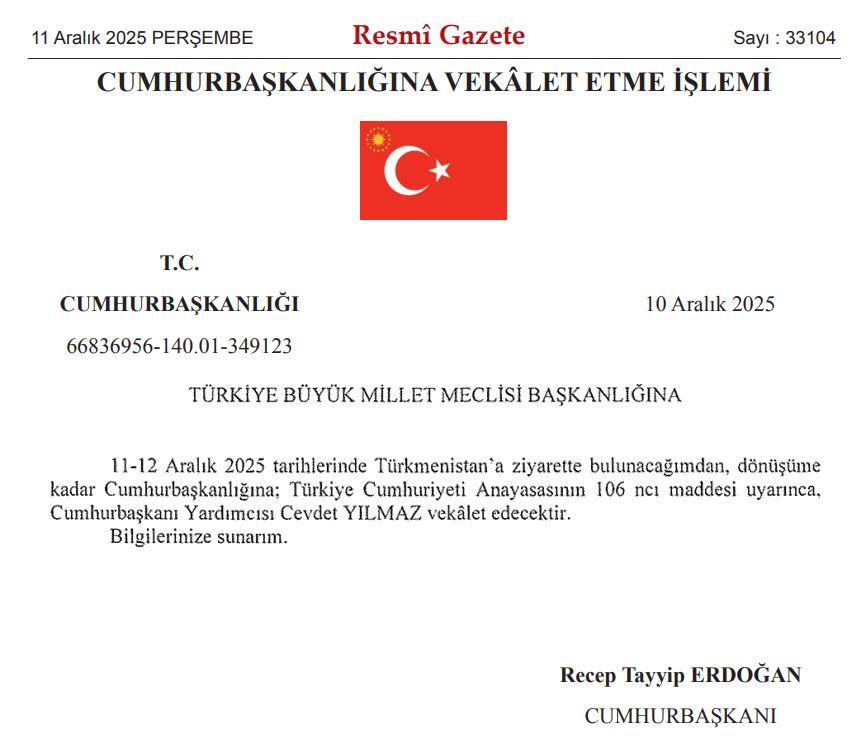Cumhurbaşkanı Recep Tayyip Erdoğan’ın Türkmenistan’a gerçekleştireceği ziyaret süresince Cumhurbaşkanlığı görevini, Cumhurbaşkanı Yardımcısı Cevdet Yılmaz’ın yürüteceğine dair tezkere Resmi Gazete’de yayımlanarak yürürlüğe girdi.